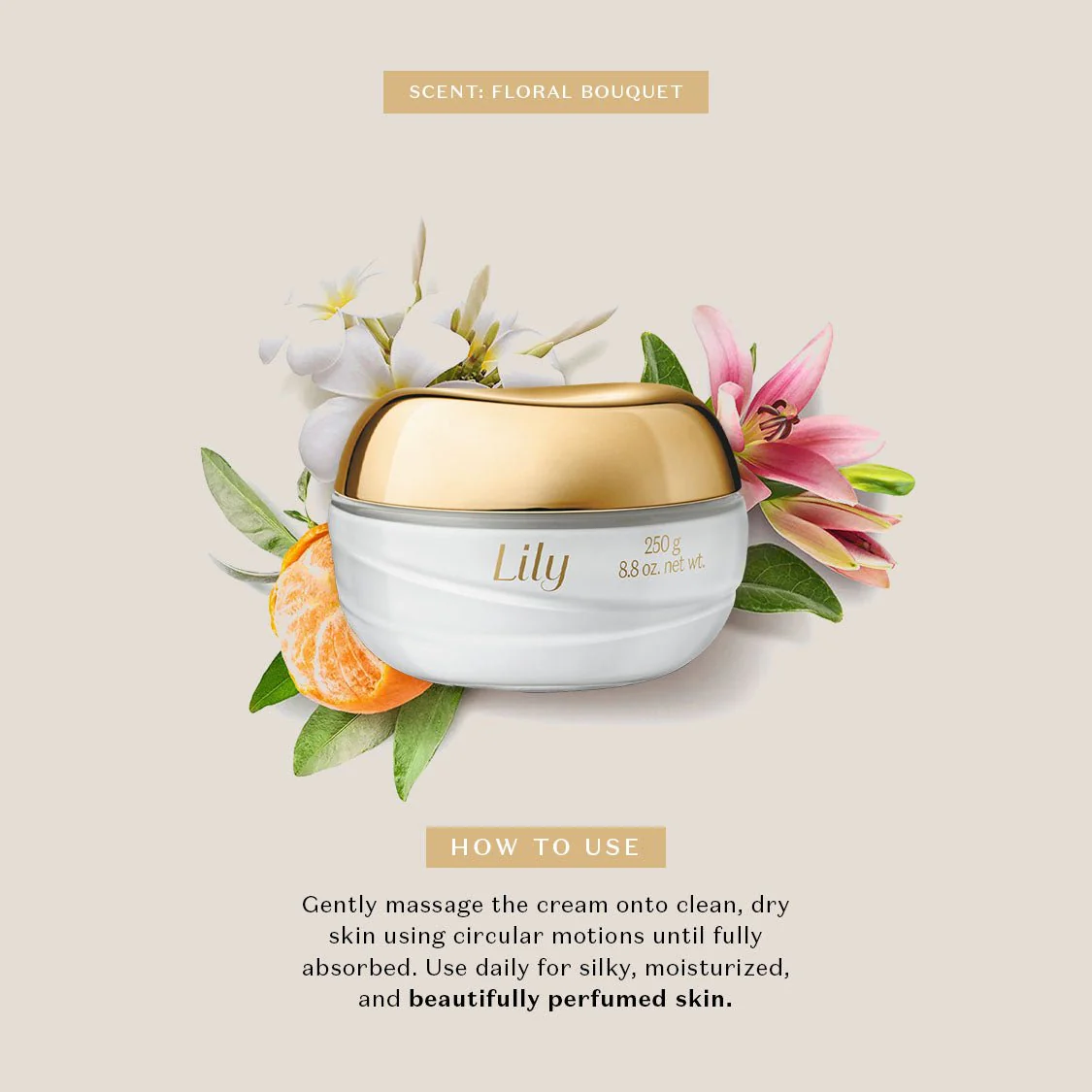 Lily Satin Hydrating Body Cream intensely nourishes the skin with its fast-absorbing satin texture, providing 48-hour hydration while leaving skin feminine and delicately scented. Enriched with Vitamin E and Shea Butter, it protects against dryness from the sun and cold weather, making every use a moment of sophisticated self-care.